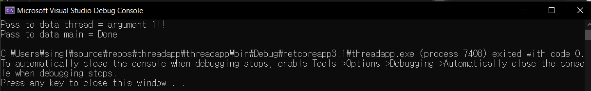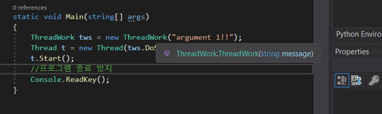 그리고 ThreadWork의 데이터를 전달 받기 위해서 클래스 레벨의 msg라는 전역 변수를 선언하고, public ThreadWork(string message)를 통해 변수를 노출하여 데이터를 받을 수 있게된다.