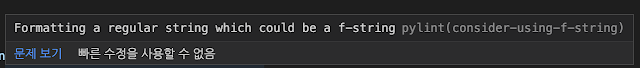 필자도 본 경고가 눈에 띄어서 찾아본 결과 Python 3.6 버전부터 만들어진 새로운 문자열 작성 방법으로 f-string 사용을 권장하는 것이다.