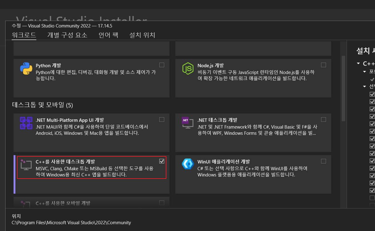 3. Visual Studio - C++를 사용한 데스크톱 개발 설치