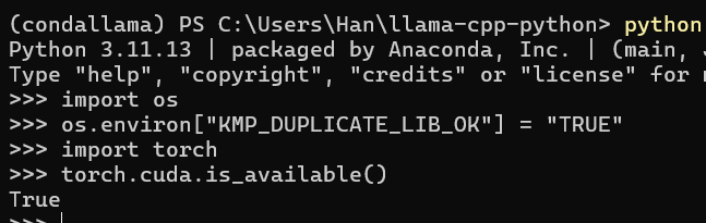 (condallama) PS C:\Users\Han\llama-cpp-python> OMP: Hint This means that multiple copies of the OpenMP runtime have been linked into the program. That is dangerous, since it can degrade performance or cause incorrect results. The best thing to do is to ensure that only a single OpenMP runtime is linked into the process, e.g. by avoiding static linking of the OpenMP runtime in any library. As an unsafe, unsupported, undocumented workaround you can set the environment variable KMP_DUPLICATE_LIB_OK=TRUE to allow the program to continue to execute, but that may cause crashes or silently produce incorrect results. For more information, please see http://www.intel.com/software/products/support/.