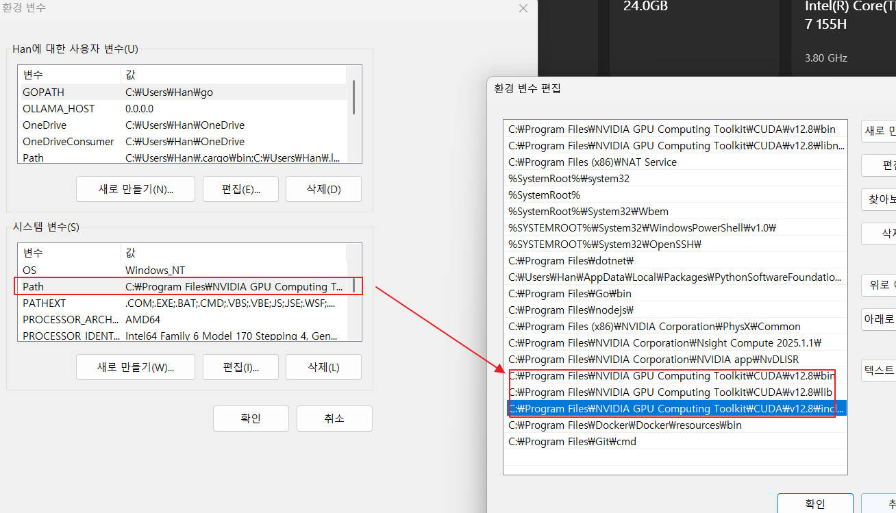 이를 설치를 진행하고 나면, 마지막으로 환경 변수 화면을 열어서 CUDAtoolkit 의 bin, include, lib 폴더를 환경을 Path에 추가해주면 사용이 전역적으로 사용할 수 있기 때문에 편리하게 사용할 수 있다. 추가해주도록 하자.