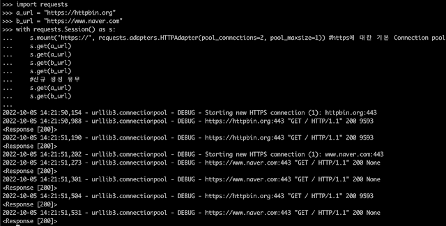 s.mount('https://', requests.adapters.HTTPAdapter(pool_connections=2, pool_maxsize=1)) #https에 대한 기본 Connection pool
